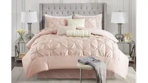 This beautifully tufted bed is from the Laurel Bedding Collection. It's gorgeous, soft blush color makes this set easy to accessorize your bedroom. The collection is made from 100% polyester polyoni and has pieced fabric sewn together to give this set dimension. It is finished with a smooth edge of fabric that creates a beautiful border around this comforter.