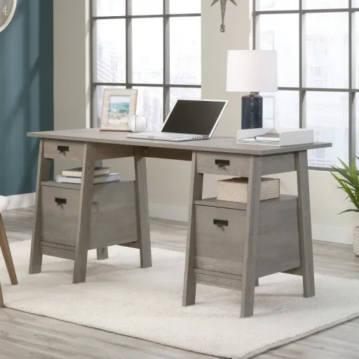 Keep your workspace organized and stylish thanks to our Trestle home office collection! This unique slanted desk gives you an eye-catching design with plenty of storage space. Two file drawers with full-extension slides, a center open shelf, and two sliding upper drawers provide plenty of organization to help you stay on task. This showstopper looks great on its own, but we think it looks best when paired with the rest of our Trestle collection for a full home office design! Customer Assembly Required