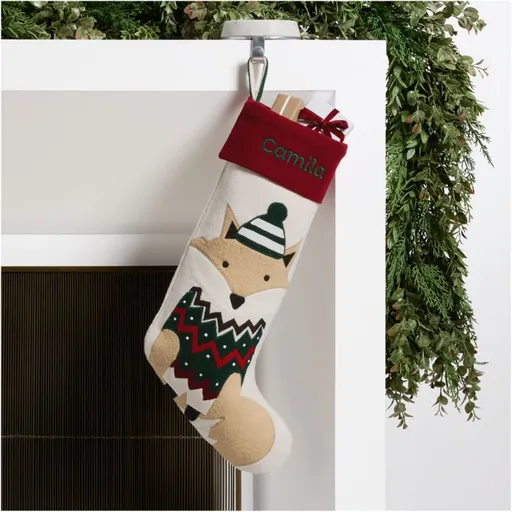 Joan Anderson's delightful Christmas stockings are back, this time with her signature critters decked in cozy Fair Isle sweaters. Bundled up for the winter in a pine green-striped stocking cap topped with a jaunty pompom, a festive fox poses on our creamy wool-blend stocking. Finished with a rich red cuff perfect for personalizing, the wool-blend Christmas stocking coordinates with the rest of our Fair Isle Friends holiday collection.