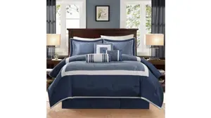 The Genevieve king 7-pc. comforter set creates a neutral feel to your space with a shades of blue. This set is made from 100% polyester polyoni creating a sheen to the navy, silver and blue gray colorways in this bed. The deep navy color creates a large border around the edge of the comforter and a silver border is used inside to really give the blue gray a pop in the center. The Decorative pillows make use of these same borders and colors for a completely matching set while the navy bedskirt adds some drama with its dark coloring. With these neutral colorways and large borders, this set will be easy to accessorize in any room in your home.