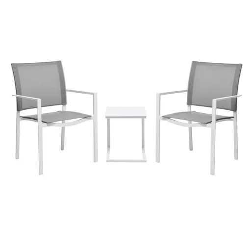 The Mykonos Gray 3-Piece Patio Set adds a modern touch to your balcony. The side table is enhanced with L-shape style and white powder coated aluminum construction. The two-tone contrast of the dining chairs is gorgeous with white powder coated aluminum construction and gray polyester and acrylic blend upholstery.