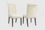 The Eleanor Beige Uph Dining Side Chair Set Of 2 brings a touch of traditional elegance to your dining space. These chairs feature a sophisticated beige fabric upholstery complemented by smokey black rubberwood legs. The rolled backs and button-tufted design, adorned with bold nailhead trim, add a classic and cottage charm to any room.