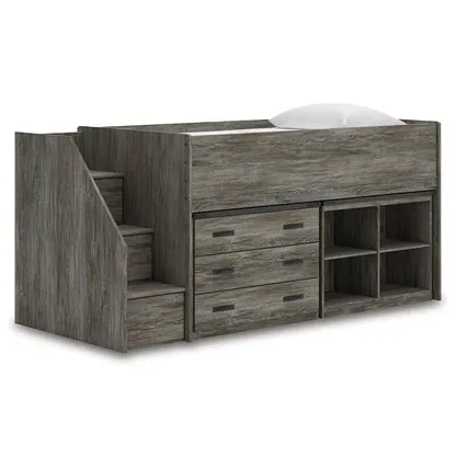 Cool, casual style is for all ages. With this twin loft bed with drawer storage, they get the function they need plus with the refined design you love. Approachably neutral in a rustic warm gray, it’s adaptable enough to pair with an assortment of existing colors and room decor. Faux metal detailing with nailhead accents lends an industrial edge. And with its included drawers and bookcase, this space-saving bed doubles as a storage solution for clothes, books and everything in between.