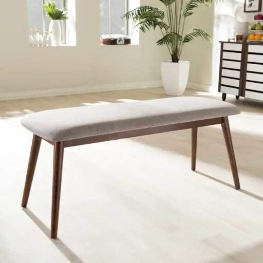 Crafted from sumptuous medium oak, the Flora dining bench brings a warm feel to an interior pairing with a wide variety of modern and classical styled furnishings. The graceful lines of the dining bench are achieved through the expert craftsmanship, distinctive curved and rounded edges along the sides and the smooth grained textured of the bench. Designed for everyday living, this seat is supported by four tapered legs each of which is set at an angle to create a modern profile while also enabling more legroom underneath. Constructed of solid rubberwood, the dining bench is upholstered in light Gray fabric with padded cushions. Made in Malaysia, the dining bench requires assembly. Available for Online Purchase Only. Ships Directly from the Manufacturer. RC Willey Delivery is Not Available. Assembly required.