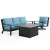 Experience the oversized comfort and structural strength of our exclusive Montecito Collection, featuring a handmade aluminum frame with a durable multi-step powder-coated and oven-baked clear coat finish. Each piece in this 3 piece swivel sofa group with a fire pit is built by laser welding to create fully welded and braced frames with zero weld marks. The sofa and swivel club rocker feature PVC sling seat suspenion and include oversized deluxe Sunbrella® acrylic cushions. The textilene material's flexibility and sturdiness make it a comfortable material for seating.