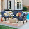 Get lost in the oversized comfort and structurally sound furniture of our exclusive Fairmont Collection. Feel the cool touch of the handmade aluminum frame, featuring a multi-step powder-coated and oven-baked clear coat finish. Each piece in this 4 piece loveseat group is constructed by laser welding to create fully welded and braced frames with zero weld marks. The loveseat and club chairs feature PVC sling seat suspenion and include oversized deluxe Sunbrella® acrylic cushions. The textilene material's flexibility and sturdiness make it a comfortable material for seating. The 31 in. round coffee table features a travertine stone design comprised of concrete with a rib finish.