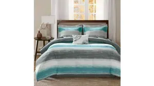 The Saben California King 9-pc. comforter and sheet set provides a modern update to your bedroom. A watercolor stripe print is beautifully displayed on the ultra-soft microfiber comforter. The matching shams mirror the pattern of the comforter, while an embroidered Decorative pillow and a solid gray bed skirt to complete the bedding set. A coordinating textured gray cotton sheet set is also included to complement the casual style of the comforter. Bringing the best in health and wellness, this bedding set features an anti-microbial treatment - that is safe and non-harmful to humans and the environment - to prevent odors caused by bacteria, reduces the risk of bacteria growth, enhances hygiene, and keeps fabric feeling fresher, longer. This bedding set is also OEKO-TEX certified, meaning it does not contain any harmful substances or chemicals, ensuring quality comfort and wellness.