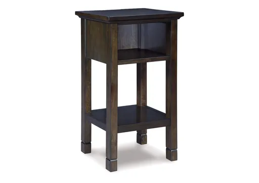 Your home called. It asked for the Marnville accent table. Its dark brown finish is simply irresistible, elevating the silhouette with elegance. Clean lines maintain the contemporary aesthetic you crave. The open cubby and bottom shelf provide storage for essentials and decor. Power up your devices with USB ports. How’s that for form and function?
