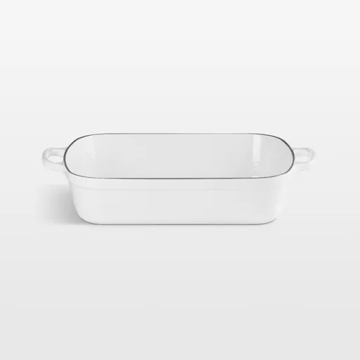 Smooth enamel in white coats this gorgeous cast iron roaster. Requiring no seasoning, the durable finish resists dulling, staining, chipping and cracking. This roasting pan goes effortlessly from stove to oven to table to serve five to six servings of pot roast, casserole or strawberry crisp.