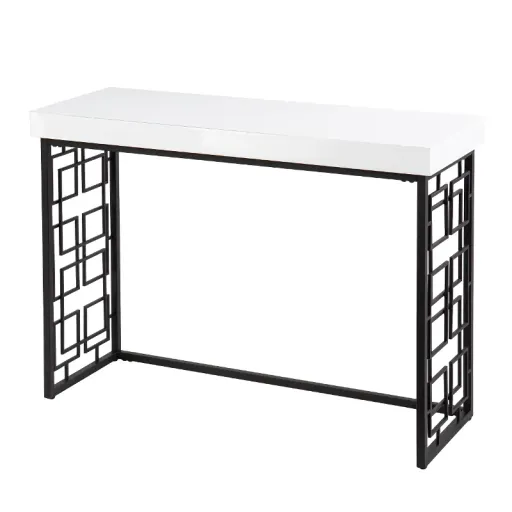 Invite a modern look into your home with this two-tone entryway table. A spacious glass tabletop displays family photos and curated décor while the contrasting metal frame crafts a contemporary design. Open side panels feature interlocking squares creating an Asian-inspired feel. Add the finishing touch to your décor when you place this unique console table in your entryway or living space. Available for Online Purchase Only. Ships Directly from the Manufacturer. RC Willey Delivery is Not Available. Assembly required.