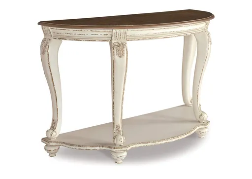 Elevating the art of traditional cottage styling, the Realyn demilune sofa table is sure to serve you beautifully for years to come. Antiqued two-tone aesthetic blends a chipped white with a distressed wood finished top for added charm. Classic cabriole legs and shapely lower shelf are a lovely twist. Decorative corbels add refinement.