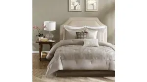 The Madison Park Trinity Collection provides a modern look through fabric manipulation. This beautiful taupe polyester charmeuse gives a slight sheen to this bed while the small pleating on the bottom half of the bed and corresponding shams provides great dimension for your room. Three decorative pillows use embroidery and pleating to bring this beautiful collection together.