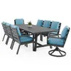 Experience the oversized comfort and structural strength of our exclusive Montecito Collection, featuring a handmade aluminum frame with a durable multi-step powder-coated and oven-baked clear coat finish. Each piece in this 9 piece combo dining set is built by laser welding to create fully welded and braced frames with zero weld marks. The dining chairs and swivel rockers feature PVC sling seat suspenion and include oversized deluxe Sunbrella® acrylic cushions. The textilene material's flexibility and sturdiness make it a comfortable material for seating. The 100 x 40 in. rectangular dining table features 6 in. slats and a farmhouse-style base for extra stability.