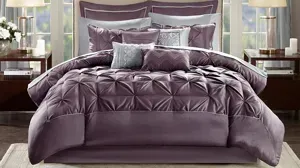 Update your entire space instantly with the Jelena 24-pc. Room in a Bag. The bold red base on this comforter works beautifully with the soft white and red piecing. Decorative embroidery adorns the bottom portion of this comforter and the center of each sham creating a rich look in your space. Four solid red window panels, four taupe tie backs and two embroidered valances accompany your new bedding for a whole room makeover. Four embroidered decorative pillows, two shams and a bedskirt put the finishing touches on this complete look.