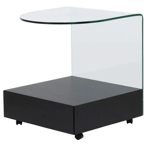 The Maria Black Side Table is all about glam. This attractive table is made of wood and glass, and features built-in casters and a storage drawer. With a smooth, glossy look and incredible modern style, this eye-catching piece is sure to turn heads.