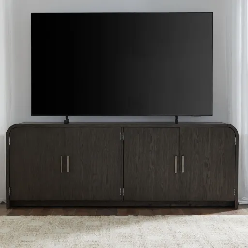 This 82 inch TV console is the perfect blend of sophistication and functionality for your entertainment space. Meticulously crafted using Rubberwood solids and Split Heart White Oak veneers, this console features an Espresso finish. The console boasts soft shaping, highlighted by a gracefully rounded waterfall edge, adding a touch of elegance to any room. Designed for both style and convenience, the console features four flat cut doors adorned with Satin Nickel bar pull hardware, lending a modern yet timeless appeal. Behind each set of doors, you'll discover an adjustable wood shelf, providing ample storage to organize your media devices, gaming consoles, and more. Say goodbye to tangled wires and cluttered cables. With integrated wire management provisions, this console ensures your space remains tidy and organized, allowing you to enjoy seamless entertainment without the hassle of unsightly cords. Whether you're hosting a movie night with friends or simply unwinding with your favorite show, this 82 inch TV console combines sleek design with practical functionality, elevating your viewing experience to new heights.
