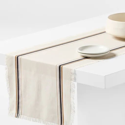 Our laid-back Craft runner sets a stylish and casual table. Made of slubby organic cotton, the taupe table runner features two sets of brown, off-white and black lines of varying widths and weave textures. Fringe bordering on all four sides lends softness and an artisanal look. Great for weeknight meals or fancy dinners, the table runner cleans up easily in the washing machine.