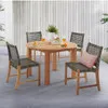 The Hampton collection offers a blend of materials in a contemporary look that adds warmth and substance to your space. The dining side chairs feature a neutral shade of resin wicker strands over a solid teak frame. The seating is fully assembled and cross braced to provide extra support. The weave pattern allows air to flow through, keeping you cool while you lounge outside. The dining table is composed of solid teak and has a fine, sanded finish with a slat-top design. Each piece is a combination of machine-made for precision and handmade with traditional Mortise and Tenon construction for smooth and tight joinery.