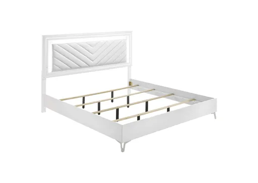 This modern bed showcases a high-gloss white frame paired with a bold LED-lit headboard for striking impact. The panel headboard features a white faux leather insert with chevron channel tufting, framed by a white LED trim that casts soft ambient light. Clean edges and chrome-finished legs enhance its sleek silhouette, while the low footboard keeps the focus on the illuminated design. A foundation is required to complete this stylish bedroom centerpiece.