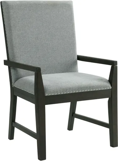 Experience the perfect blend of comfort and sophistication with the Donavan upholstered dining arm chair. Featuring plush cushioning, soft gray fabric, and supportive armrests, it offers a luxurious seating experience. The sturdy dark-finished frame adds a bold contrast, making it a stylish addition to any dining space.