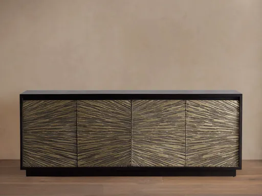 Iconic midcentury modern design meets glamourous style with our Helios Collection. Crafted by Indian artisans, each piece is made from engineered hardwood with teak veneers and a rich ebony finish that’s complemented by gorgeous brass doors. Keep essentials close on ample shelving concealed behind the four doors for an accent piece perfect for any space from entryway to living room and beyond.