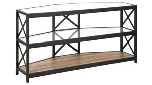 Make the most of your space with the clever shape of this five-sided Dion TV stand. It's designed to nestle perfectly in the corner of your living room, bedroom, or den with plenty of clearance for your cord management situation. The luxe look of repeated geometric X's in rich finishing bring this classic design ahead of the trend curve. Featuring a tempered glass top and a wooden lower accent shelf with a rustic finish, this TV stand is streamlined and durable in any living room or den.