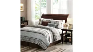 To add a touch of richness to your current d_cor, the Princeton 5-pc. Coverlet Set can update your room in seconds. Made from polyester, the coverlet and shams share leaf, striping and medallion motifs that are accentuated by channel stitching on a chocolate brown base. Pops of blue are also used throughout this collection adding a lavish feeling to your decor. Two decorative pillows feature pleating and embroidery details that correspond back to the coverlet to bring this entire look together.