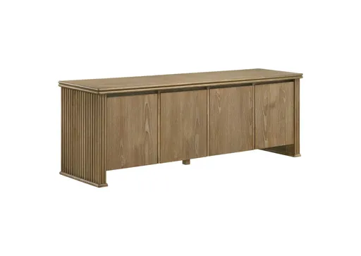 This seventy-inch TV stand combines sculptural texture and functional storage for a grounded living room anchor. Four flat-panel doors conceal generous interior space, complete with fixed shelving and rear cable access cutouts for organized media setup. Vertical reeding along the sides adds visual rhythm to the clean-lined form, while a distressed light brown finish highlights the natural grain. Built from engineered wood and oak veneer, this media console offers both form and utility.