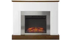 The Vicente fireplace has a dark tobacco accents complement a fresh white finish, while the metal surround creates a modern industrial feel in any room. Glowing faux fire logs and flickering flames craft a realistic fireplace look, bringing warm ambiance to your living room or dining area, with or without heat.