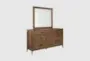 The Cade Brown Wood 6-Drawer Dresser with Mirror | Mahogany is an excellent addition to any bedroom, offering ample storage and a stylish look. Crafted from mahogany, this dresser features six spacious drawers and a convenient mirror. Its mid-century modern design adds a touch of sophistication to your space.