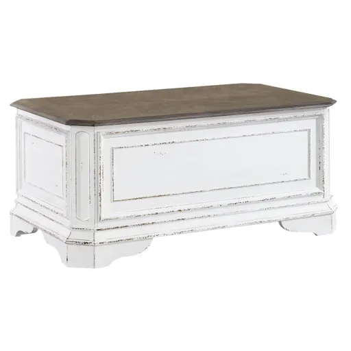Highlighted by vintage and rustic style accents, this beautiful storage trunk adds accommodating design to your living space. Featuring a cedar lined interior, a removeable tray, and casters, this piece is the perfect mix of style and function. Completed with bead molding, canted corners, and a fancy face top, as well as an antique white finish, this piece presents formal elegance for your home.