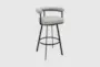 The Adelaide Swivel 30" Barstool in black metal with light grey stain-resistant faux leather is a perfect addition to your dining room or kitchen. Its modern design, combined with practical features, ensures both comfort and style for any food prep or serving space. The swivel function allows for easy movement, making it a versatile option for various settings.