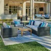 The Laguna Collection is a casual contemporary outdoor patio collection with a tightly woven, wicker design, for a transitional look that won't go out of style. The 4 piece sofa group offers a blend of materials consisting of wicker and teak that adds warmth and substance to your space. The sofa and club chairs are handwoven with 8mm full round PE synthetic strands of resin wicker, treated with UV inhibitors, over a fully welded, handmade aluminum frame with a multi-step powder-coated finish and supported inner walls. They are resort sized and feature textilene seat suspension. The textilene material's flexibility and sturdiness make it a comfortable material for seating. The Mandalay coffee table is composed of solid teak and has a fine, sanded finish with an natural-based stain. It is a combination of machine-made for precision and handmade with traditional Mortise and Tenon construction for smooth and tight joinery.