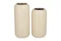 The sophisticated and minimalist design of this cream round cylindrical decorative vase set makes it an instant conversation piece and a gorgeous accent decor for your home. Designed with felt or rubber stoppers at the base that prevent scratching furniture and table tops, as well as sliding around. This item ships in 1 carton. Suitable for indoor use only. This item ships fully assembled in one piece. Made in India. This cream colored vase comes as a set of 2. Modern style. Vases have a 3.50 in, and 3.50 in mouth openings.