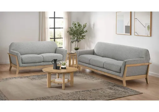 Gracefully curved silhouettes and retro-inspired lines define this timeless seating ensemble. Sculpted flared arms, contoured backrests, and plush cushions blend form and function with refined ease. Upholstered in soft grey polyester and framed in light blonde rubberwood, each piece offers a perfect balance of comfort and mid-century style. Ideal for living rooms or lounge areas, this tailored set brings cozy sophistication to any setting.