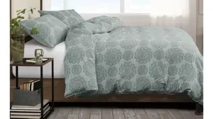 Give your bedroom a casual update with the McKinley 3-pc. Duvet Set! The vintage stonewashing technique used on the breathable cotton adds to the lived-in look of the jacquard medallion design. McKinley is also designed to become more supple with every wash, making this easy-care set the perfect addition to your relaxed style. Each piece is finished with a matching cotton crochet trim to complete the look. The duvet and shams reverse to matching solid fabric. Included is 1 duvet and 2 king shams.