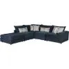 Elise 5 Piece Sectional with RAF Chair from Fusion Furniture. Includes RAF chair, two Armless chairs, Corner and Ottoman. Frame constructed of hardwoods and furniture grade plywood. Quality foam cushion core construction. Covered in a navy ink colored polyester fabric. Includes 2 accent pillows in Mundo Mystic, 2 accent pillows in Newton Spray and 2 kidney pillows in Karoo Mystic, not sold separately. Spot clean with water-free solvents, cc WS.