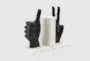 Introducing the Set of Two Multicolor Black Rectangle Metal Faux Marble Hand Sign Bookends, designed to bring a touch of contemporary flair to your space. These bookends are crafted from aluminum and feature a unique hand sign shape that adds a playful yet sophisticated element to your decor. The combination of black metal and faux marble provides durability and visual appeal, making them a perfect addition to any bookshelf or desk.