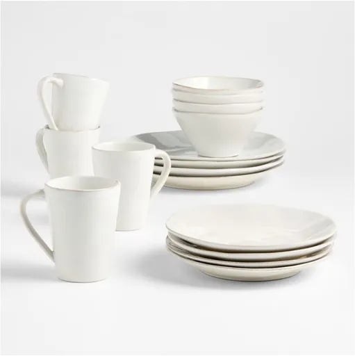 Artisanal ceramic shapes are glazed a soft white with subtle hand-antiquing on the freeform rims. The unique form suits organic modern tables and is plenty chic for elegant occasions, while the durable stoneware is sturdy enough for use every day. Microwave-safe and oven-safe up to 300°F, our Marin dinnerware is also dishwasher-safe for easy cleanup after dinner parties. This set, a Crate and Barrel exclusive, includes 4 dinner plates, 4 salad plates, 4 bowls and 4 mugs. To set a coordinated table, add our Marin serving pieces. Due to their handcrafted nature, each piece will be slightly unique.