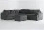 The Zoeller Charcoal Grey Fabric 2 Piece 127" L-Shaped Sectional features a right arm facing sofa and ottoman. This casual sectional offers comfort and style, making it a perfect fit for any living room. Upholstered in Elon Charcoal fabric, it is designed to complement various decor themes.