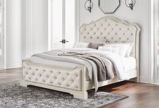 Add a touch of romance to your home with this king upholstered bed. The antiqued white painted finish and serpentine-shaped silhouette details are the picture of easy elegance. Indulge your love of luxury with decadent button-tufted cushioning from head to toe.