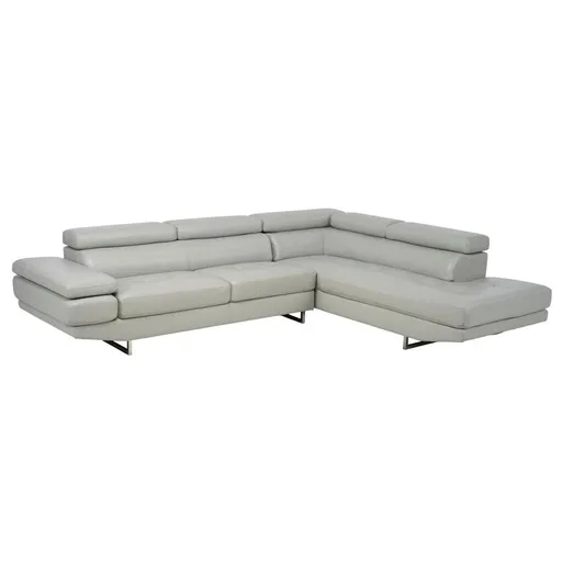 You'll love the simple, modern elegance of the Tahoe Gray Corner Sofa w/Right Chaise. This leatherette couch is as attractive as it comfortable. Its sleek metal legs and stylish gray color add sophistication to any space. Plus, you'll love its adjustable headrests and armrests, hidden storage, and deep, wide seating.