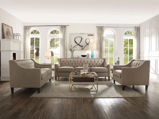 Suzanne Living Room Set Classic, Sophisticated Style Deep Button Tufted Seat Back Loose Seat Cushions Curved Shelter Armrest Wood Tapered Legs 8-Way Hand Tied Pocket Coil, Feather Down Seating Beige Fabric Upholstery This Sofa Set Includes Sofa 90 Long x 34 Wide x 34 High Love Seat 65 Long x 34 Wide x 34 High Free Delivery Also Available Chair 41 Long x 34 Wide x 34 High