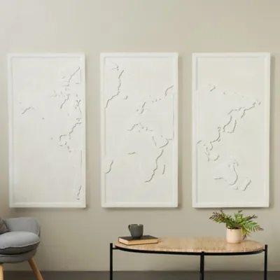 Ideal for living rooms or offices, this world map set of 3 wall sculpture enhances any environment. This item ships in 1 carton. Can be hung vertically using the d-rings; nails and screws not included. Suitable for indoor use only. This item ships fully assembled in one piece. This white colored mdf wall sculptures comes as a set of 3. Contemporary style.