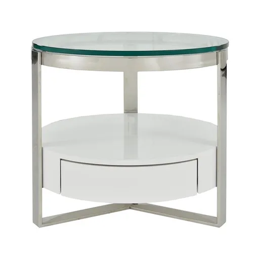 The Cali Side Table brings a smooth glossy look to any sized living room with clear tempered glass and pure white engineered wood with a sleek stainless steel frame. Open display space and one drawer are included for your storage options.