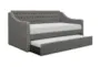 The Filmore Grey Twin Upholstered Daybed with Pull-Out Twin Trundle is a perfect addition to any bedroom or kids' room. The dark grey fabric adds a touch of sophistication, while the tufted detailing enhances its traditional charm. This versatile daybed includes a pull-out trundle, offering additional sleeping space for guests or sleepovers.