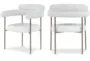 Enhance your dining experience with the Laki White Vegan Leather Upholstered Dining Arm Chair Set. These modern chairs feature a cream boucle fabric and vegan leather upholstery, providing both comfort and style. The brass leg frame adds a touch of sophistication to any dining room or kitchen.