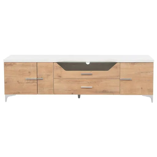 What's not to love about the super chic, ultra-modern Cordoba TV Stand? Made in Spain, this eye-catching entertainment base features two soft-closing cabinet doors, soft-closing drawers with fully finished interiors, and wire management cutouts to reduce messy, unsightly cords. Made of wood with angled metal legs, this impressive base boasts a two-tone combination and contemporary appeal that are sure to turn heads.