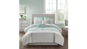 Add a refreshing new look to your bedroom with the Tinsley 8-pc. king comforter set. Made from ultra-soft microfiber, the seafoam and gray comforter flaunts a piece design with pleated accents that add dimension and charm. Quilting and pintuck details create a beautiful textural look and feel, while a solid gray reverse complements the top of the bed. The coordinating shams reflect the design of the comforter and seafoam Euro shams with gray flanges complete the chic ensemble. Also included are two Decorative pillows and a solid gray bed skirt that provide the perfect finishes for the bedding set. Machine washable for easy care, this comforter set is sure to brighten up your bedroom decor.