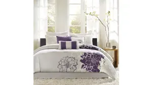 The Madison Park Lola Comforter Set brings beauty and grace to your bedroom. A large scale printed floral motif is displayed on the cotton sateen comforter and shams (1 for Twin/Twin XL Sizes) for a chic transitional look. Three decorative pillows with embroidered details and fabric manipulation add dimension to the top of the bed, while a solid bed skirt provides a clean finishing touch. This bedding set is also OEKO-TEX certified, meaning it does not contain any harmful substances or chemicals to ensure quality comfort and wellness.